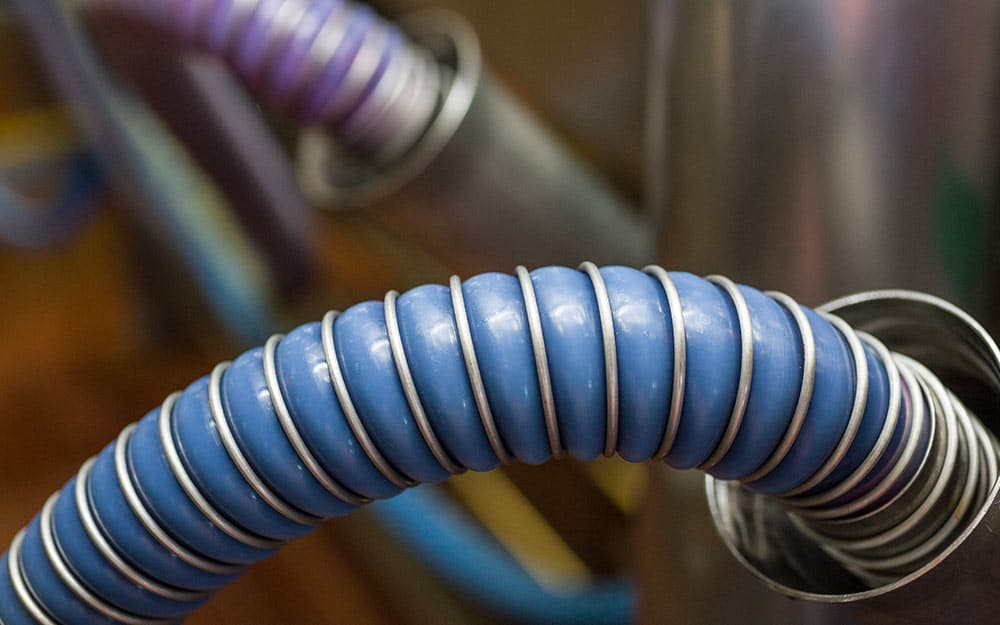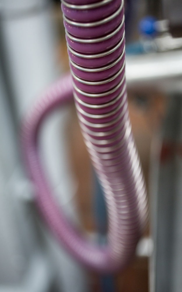 One by one the connecting pipes to the filling heads have now been replaced by transparent PTFE corrugated hoses, which are ideal for areas with high hygiene requirements. They have the advantage of being not only temperature-resistant but also odourless and tasteless – in other words, safe for use with foods. Compared with conventional industrial hoses, they greatly improve product quality, are easy to maintain and provide for CIP (cleaning-in-place) processes. In addition, PTFE hoses do not include metal parts. This is important for product safety: no metal particles can get into the containers.