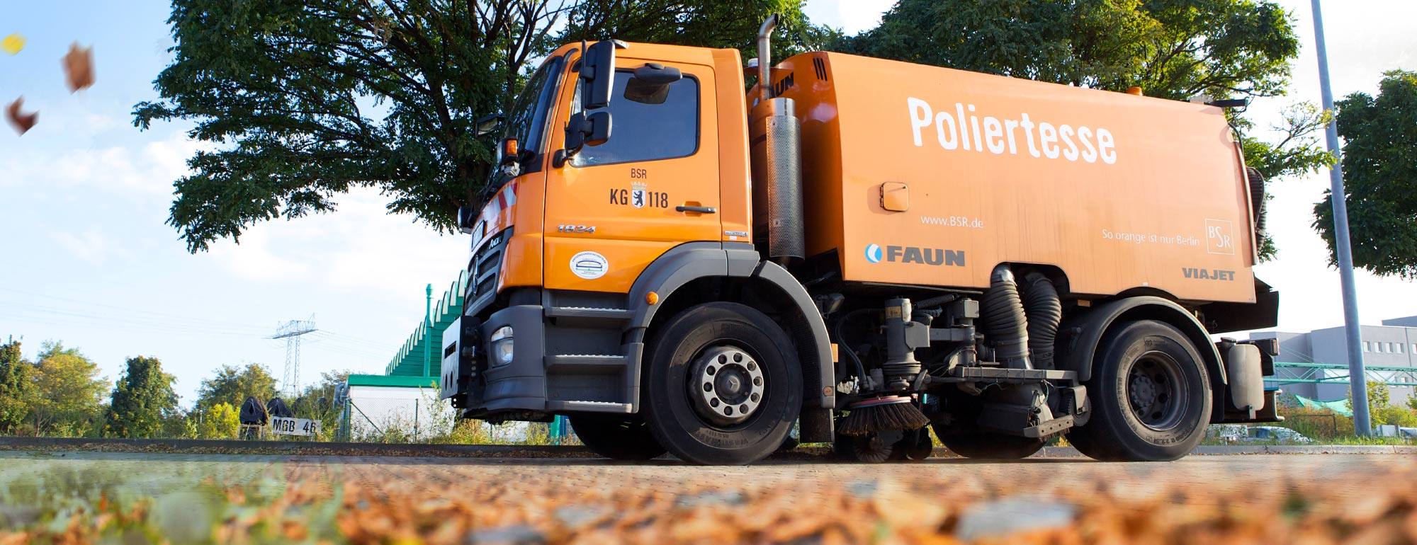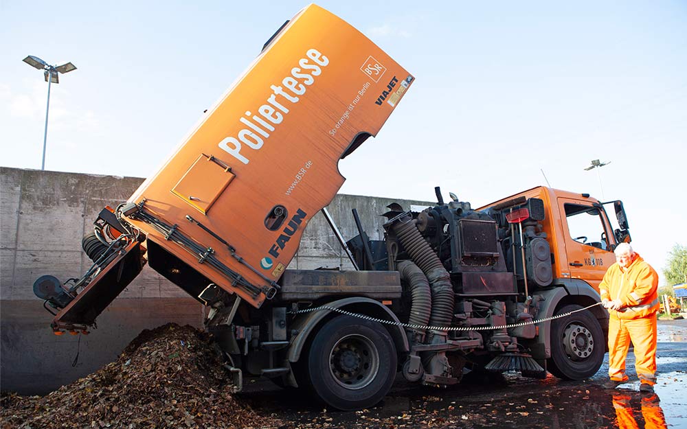 Berlin is the greenest metropolis in Europe. The streets of the capital are studded with over 400,000 trees. But the same trees that are so resplendent in spring and summer make for a heap of work – literally – in the autumn. Then, the streets and squares are strewn with more than 100,000 cubic metres of leaves. Enough to fill over 3,000 HANSA‑FLEX service containers. Removing this enormous quantity of foliage from the scene is just one of the many tasks of Berliner Stadtreinigung (BSR).