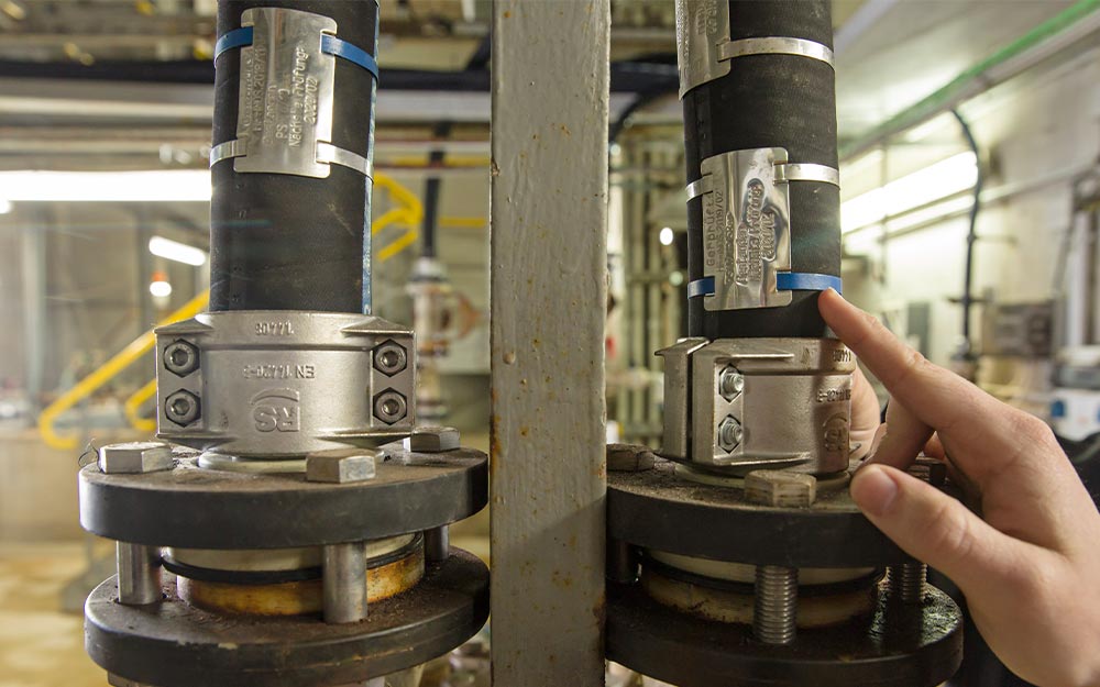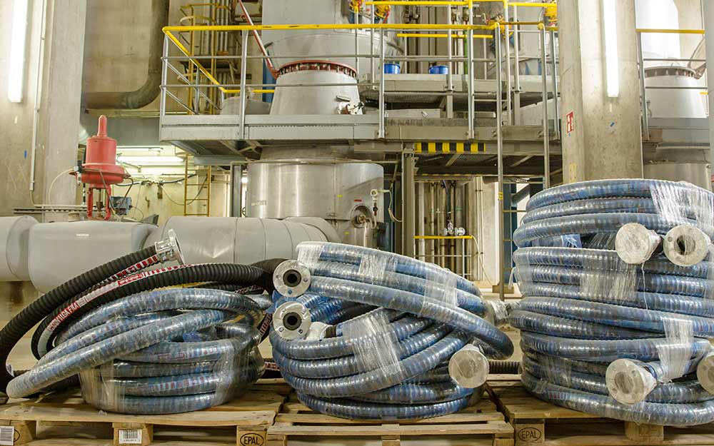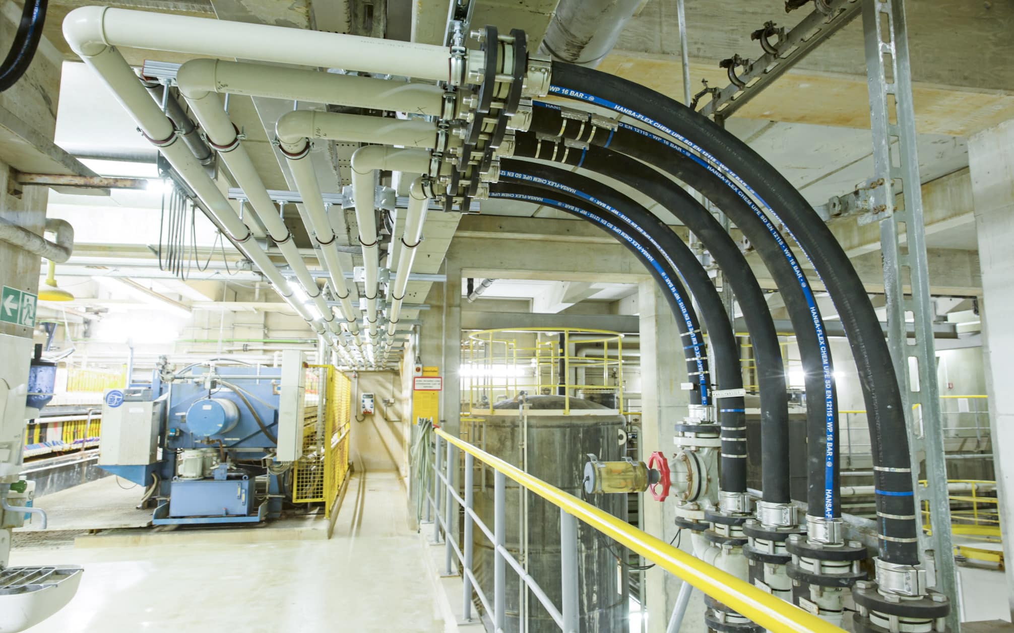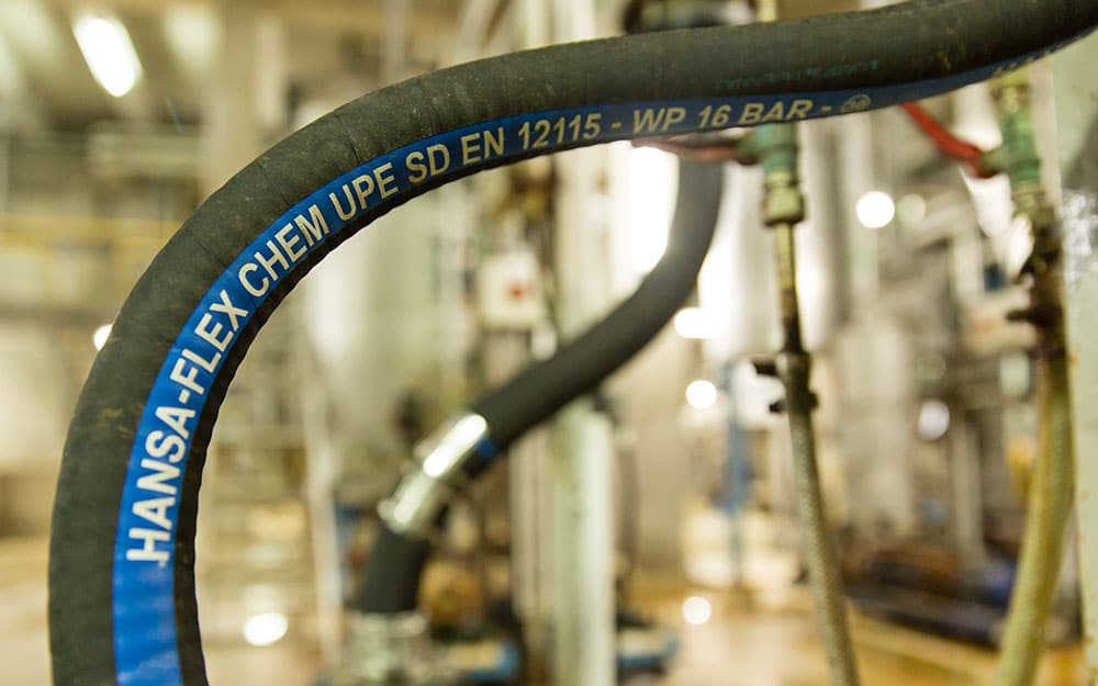 For this purpose the HANSA‑FLEX industrial hose centre in Geisenfeld and the special hose production facility in Hamburg-Stellingen work hand in hand. “We get the special hoses without fittings and assemble them ourselves,” reports Boraczynski. This also applies to the CHEM UPE SD industrial hose which is installed in the water house. “This chemical-conveying suction hose is very durable. In addition to water and waste water from the flue gas scrubbers it also transports gypsum sludge and saline media arising from the treatment of the waste water,” explains Boraczynski. In addition, HANSA‑FLEX uses corrosion-resistant plastic fittings. “In this way we can ensure a service life of up to ten years,” he adds.