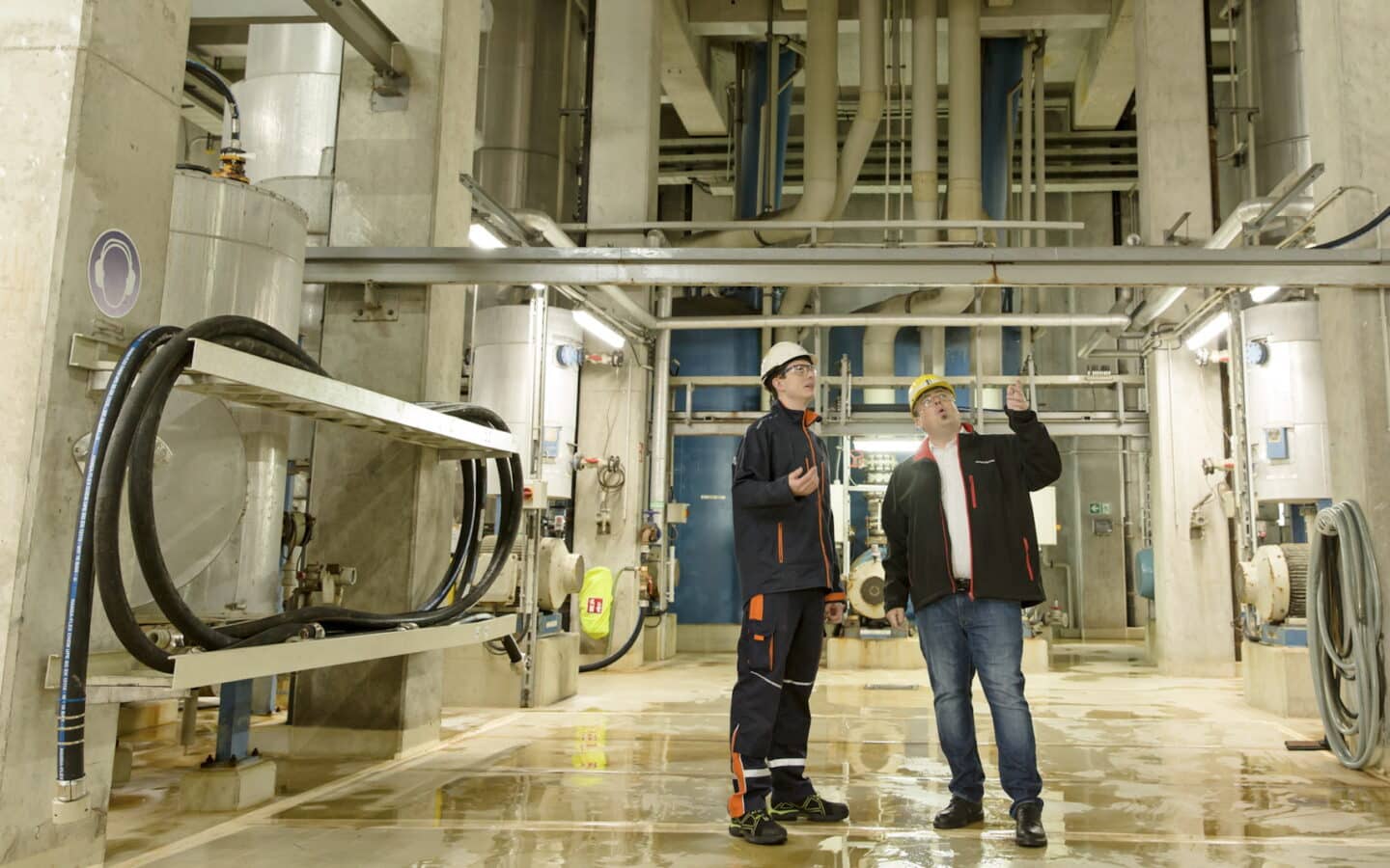 The waste water from the wet flue-gas cleaning process in the flue-gas scrubbers is reprocessed and evaporated in the so-called “water house”, a 37-meter-high building through which pipes and hoses wind. This is where technicians from the HANSA‑FLEX Industrial Service are to be found. “We take care of all the hose lines here,” reports Jacek Boraczynski, Account Manager at HANSA‑FLEX.