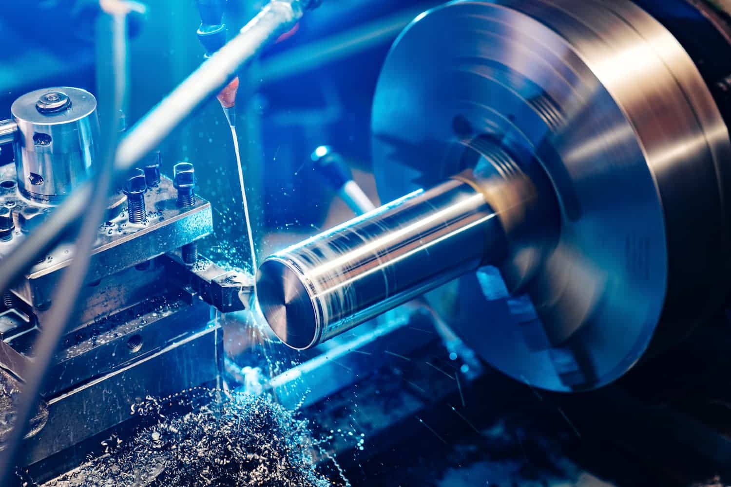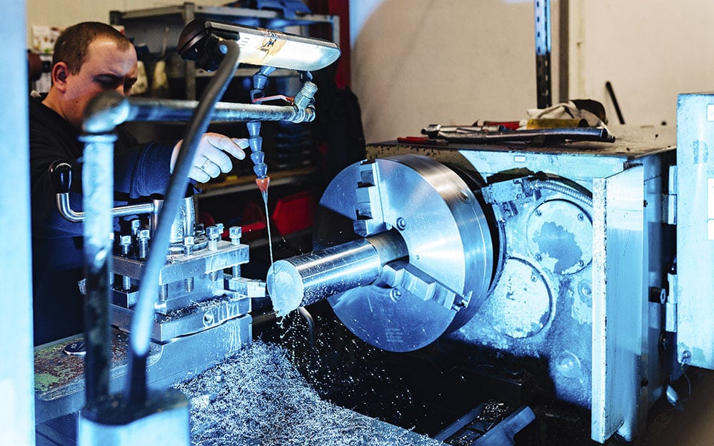 Here, a piston rod is being produced on a conventional lathe. The operator adjusts spindle speed and feed rate to match the material being worked.