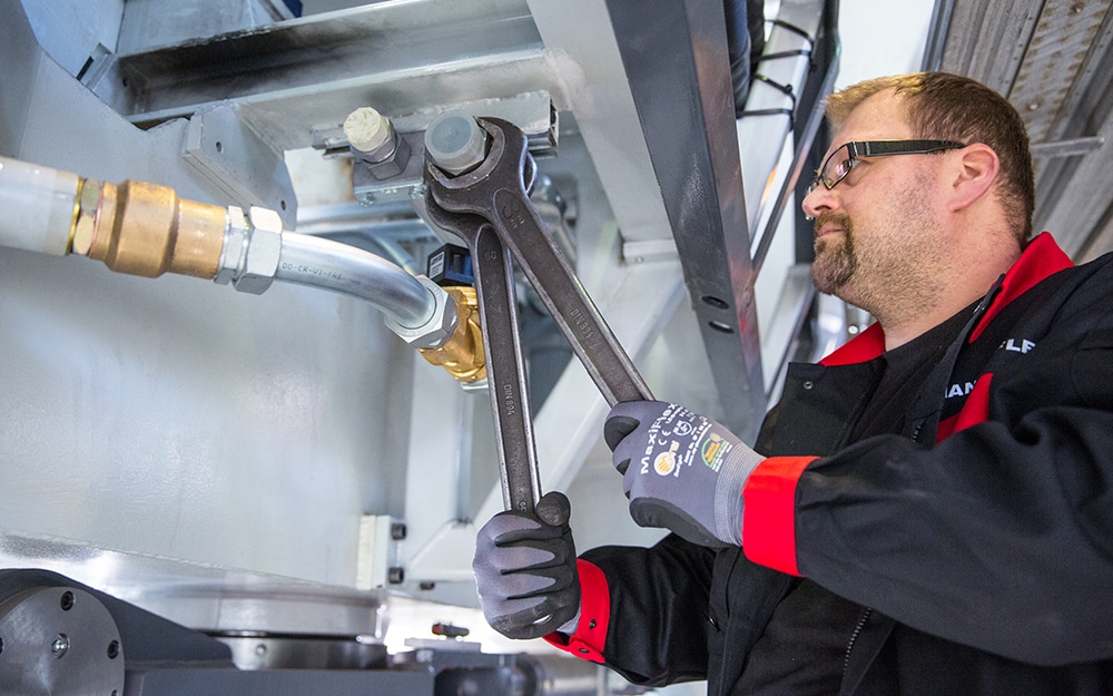 All HANSA‑FLEX fittings have large, flat contact faces to give wrenches a secure hold. During installation the fitting is held safely and securely in the wrench. The highest installation safety is ensured by over-tightening protection and a clearly detectable increase in force.