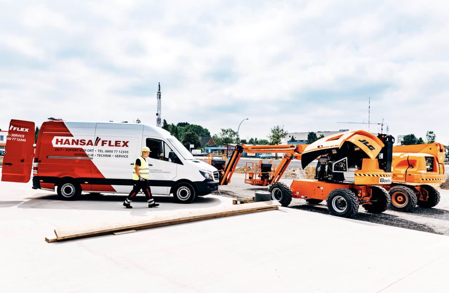 However, HANSA‑FLEX is not only in demand at Boels when the Rapid Hydraulic Service is needed on construction sites at short notice. The cooperation also covers scheduled maintenance work on large machines. When chain excavators or aerial work platforms are fitted with completely new hydraulic hose systems at the five central workshops in Hamburg, Berlin, Willich, Karlsruhe or Munich, the Industrial Service is called in together with the Rapid Hydraulic Service. Such a project usually takes several days or even weeks. Whether it’s scheduled maintenance work or emergency repairs – Thomas Stoffel is very satisfied with his hydraulic partner: “Hydraulic issues are no problem for us or our customers because HANSA‑FLEX provides us with a professional solution that deals with them quickly and efficiently.”