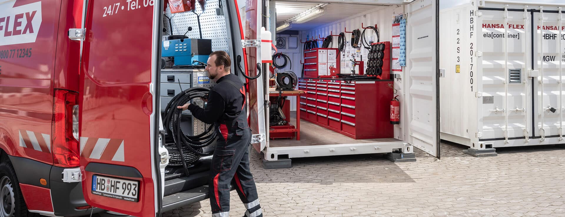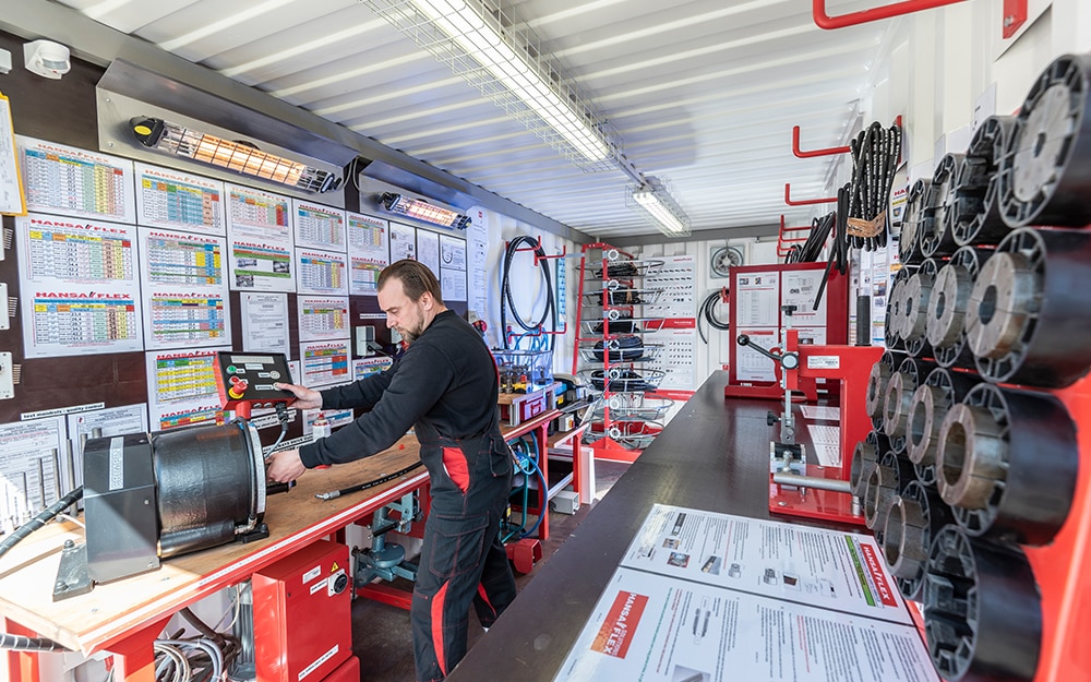 The HANSA‑FLEX service container is a valuable hydraulics workshop and can be set up on site anywhere in the world. In this way you can minimise considerable time lost and costs incurred by standstills.