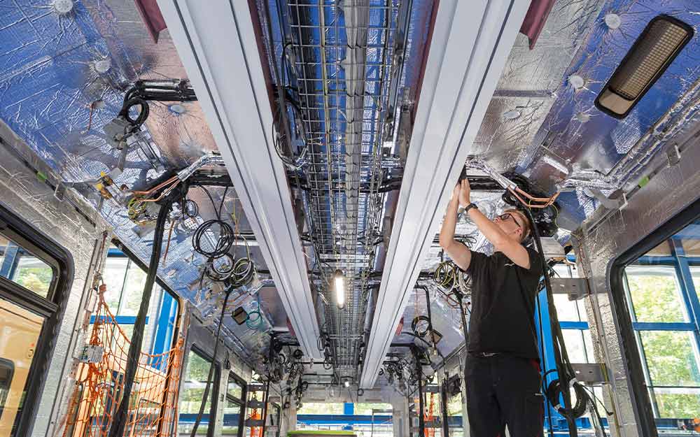 Seetõttu kavandas Stadler jagatud õhukonditsioneerimissüsteemi, mis on kompaktselt integreeritud sõiduki sisse ja alla. “See toob kaasa väga keeruka külmaaine torustiku kitsaste painutusraadiustega, mis kulgeb osaliselt põranda all ja osaliselt sisepõrandal, et kõik jääks võimalikult märkamatuks,” selgitab Nicklas Meyer, Stadleri Berliini eeslinnaraudtee projekti tehniline projektijuht.