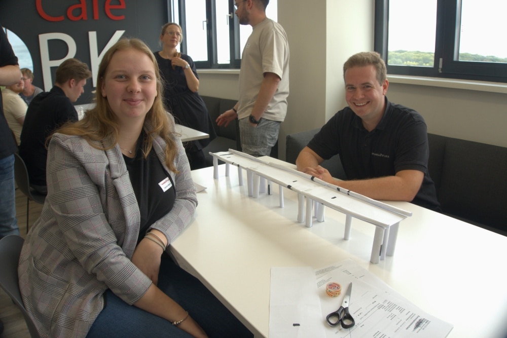 Pärast hommikusööki liitusid uute praktikantide koolitajad nendega WorkCafés. Kahe kaupa (koolitajad ja praktikandid) ehitati vanadest tellimuste korjamise paberitest sildu. Võitja, Leonie Metzner koos oma koolitaja Dominik Kunowiga, ehitas kõige tugevama ja pikema struktuuri ning võitis oma osakonnale täiskorvi maiustusi. Tema uued kolleegid MHSis olid üllatusest vaimustuses.